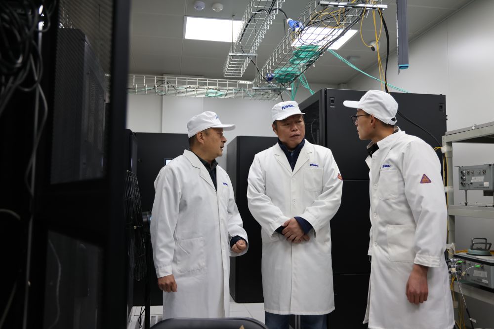 9月19日,在“千眼天珠”综合楼机房,首席科学家阎敬业研究员(中)、站长郑朝晖(左)和工作人员一起讨论工作。新华社记者 高巍 摄