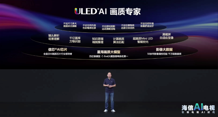 海信此次推出的AI电视新品搭载其独有的ULED AI画质平台,基于海信星海大模型赋能的全新信芯AI画质芯片和庞大影像数据库,通过知识蒸馏、迁移学习等方式,从影响用户观看的环境、内容、视角等全部维度进行AI画质计算及参数匹配,持续赋能端侧专家模型,图像的超解像能力提升一倍,环境光控精细度大幅提升,能够将普通2K画面升级至更清晰的4K,且告别环境光干扰,让用户在任何观看环境和内容下均能享受到超清画质。