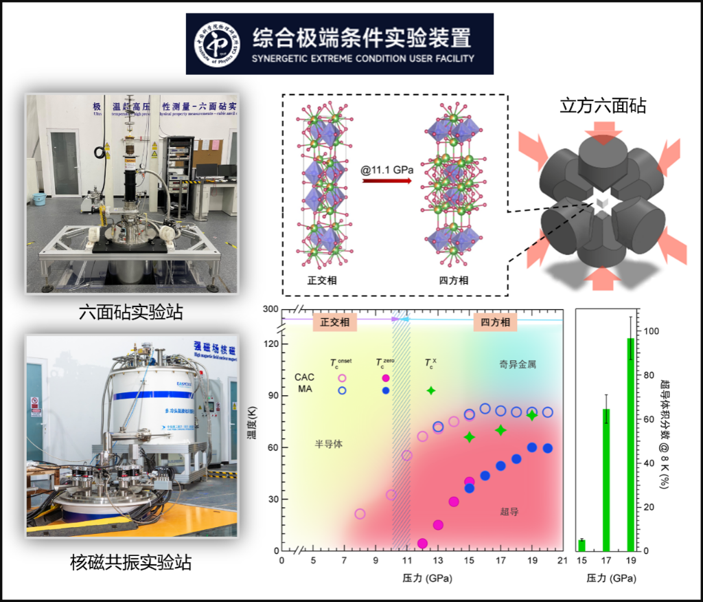 综合极端条件实验装置的六面砧高压实验站和强磁场核磁共振实验站的实物照片,以及La2PrNi2O7多晶样品的高压结构演化和超导相图。(中国科学院物理研究所供图)