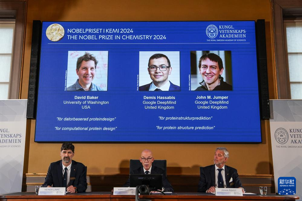 10月9日,在瑞典斯德哥尔摩举行的2024年诺贝尔化学奖公布现场,屏幕显示奖项得主美国华盛顿大学的戴维·贝克、英国伦敦谷歌旗下人工智能公司“深层思维”的德米斯·哈萨比斯和约翰·江珀。新华社记者 彭子洋 摄