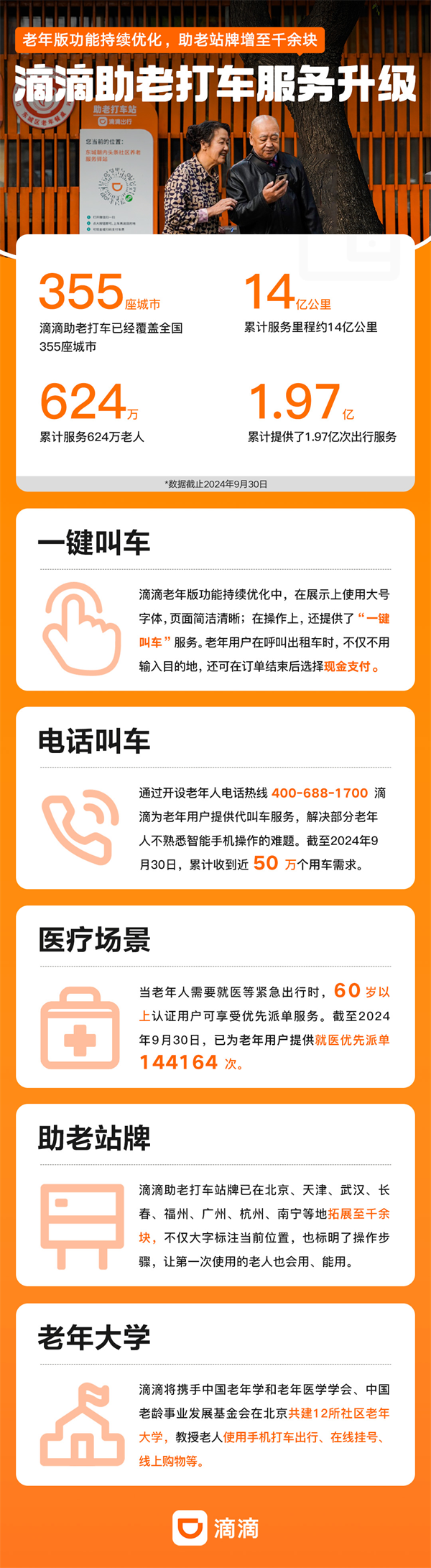 国家统计局数据显示,2023年末中国60岁及以上人口超2.9亿人。作为信息社会中的“边缘人”,为了让他们也享受到现代科技带来的便利,在主管部门指导下,滴滴于2021年1月正式上线助老打车服务。截至2024年9月30日,滴滴共为355城的624万老年人,提供了1.97亿次出行服务,累计服务里程约14亿公里。