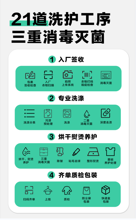 为保证洗涤效果,58到家在全国范围内甄选洗衣工厂,并制定21道洗护流程,严控衣物从入场签收到齐单包装出厂的每一道环节,对于不同材质、颜色、洗涤工艺的衣物进行分类处理,通过专业洗涤和烘干熨烫养护,经三重消毒灭菌和严格质检后,再装入58到家专用纸箱送回,确保洗涤质量的同时保护用户衣物。