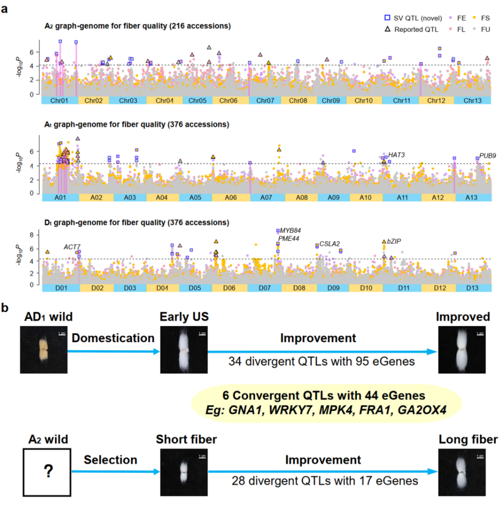 “我国是棉花生产大国、消费大国,但优质棉短缺是我国棉花产业链的短板之一。”论文第一作者、华中农业大学作物遗传改良国家重点实验室博士后李健英介绍,当前我国棉花主要栽培种是异源四倍体陆地棉,而在20世纪以前我国长期种植的棉花是二倍体亚洲棉。将二倍体亚洲棉与异源四倍体陆地棉遗传资源进行比较研究,挖掘种间平行选择和特异利用的基因,是拓宽异源四倍体陆地棉的遗传多样性,从而提升纤维品质的重要途径。
