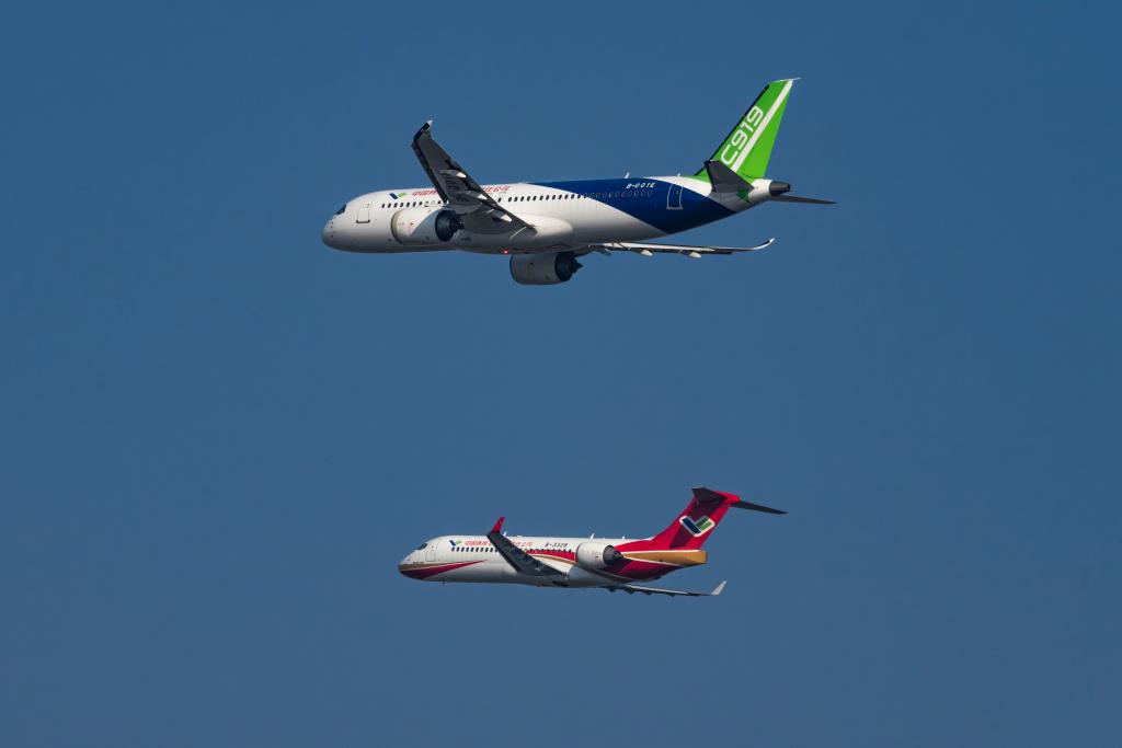 记者从中国商飞获悉,11月2日,国产飞机C919和ARJ21在2024中国航空产业大会暨南昌飞行大会上,首次完成双机编队飞行表演。
