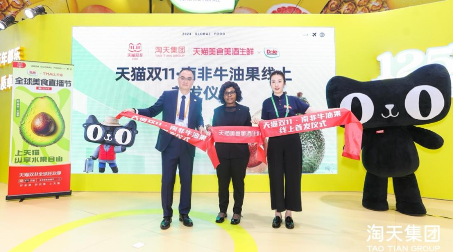 11月6日下午,淘宝天猫联合都乐在进博会食品与农产品展区举办了天猫双11南非牛油果线上首发仪式。
