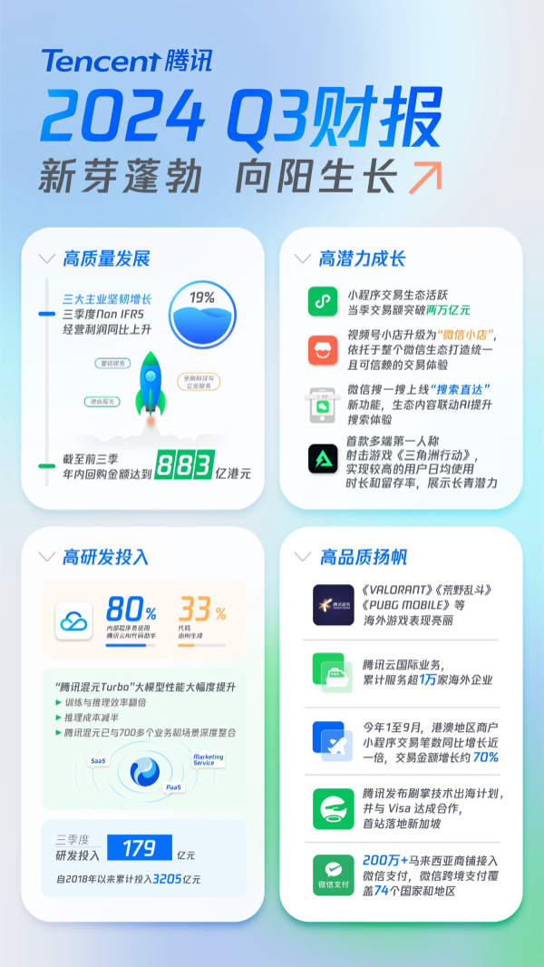 公司董事会主席兼首席执行官马化腾表示,“2024年第三季,我们的游戏业务收入实现强劲增长,得益于长青游戏在全球的稳健表现及具备长青潜力的新游戏贡献。我们围绕微信小店升级了交易平台策略,旨在依托于整个微信生态打造统一且可信赖的交易体验。我们持续在产品和运营中部署AI,包括营销服务和云服务,所带来的切实可见效益也愈加显现。我们将持续投资于AI技术、工具和解决方案,以服务用户与合作伙伴。”