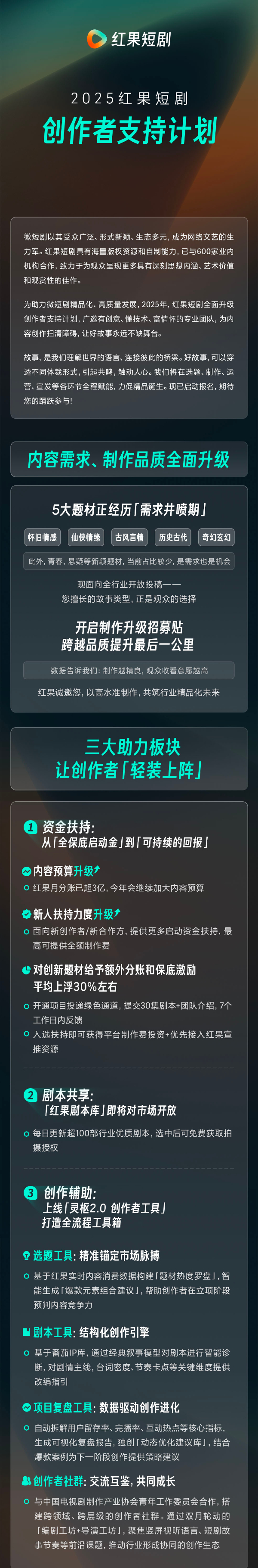 内容创新上,红果即将上线“灵枢2.0”创作者工具,为创作者提供选题热度分析、剧本智能诊断、项目数据复盘等全流程支持。此外,红果短剧将与中国电视剧制作产业协会青年工作委员会合作,搭建跨领域的创作者社群,通过“编剧工作坊+导演工作坊”,与业界探讨竖屏视听语言、短剧故事节奏等前沿课题。