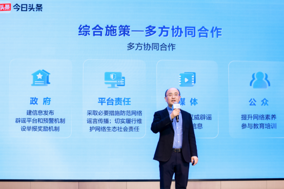 清华大学新闻与传播学院副教授陆洪磊指出,生成式AI正在重塑谣言的传播生态,技术的加持让AI谣言无论在空间、速度还是结构、方向、效果上,都更具“说服性”、虚假性和强传播性,使得传统辟谣手段难以招架。陆洪磊表示,今日头条近年来构建起涵盖内容治理制度、内容审核、辟谣教育、内外联动的四位一体防御工事,取得了较为显著的效果,对于AI谣言治理提供了一条具有可行性的发展之路。此外,道阻且长,也需要多方力量联合:比如执法机构需要做好法治保障的护盘手,建立“技术取证-电子证据-司法鉴定”的全链条执法标准;而每位用户也都应当成为理性的受者和传者,对可疑内容主动进行核实。最后,陆洪磊呼吁有更多像今日头条这样的平台携手,共同应对网络乱象治理。