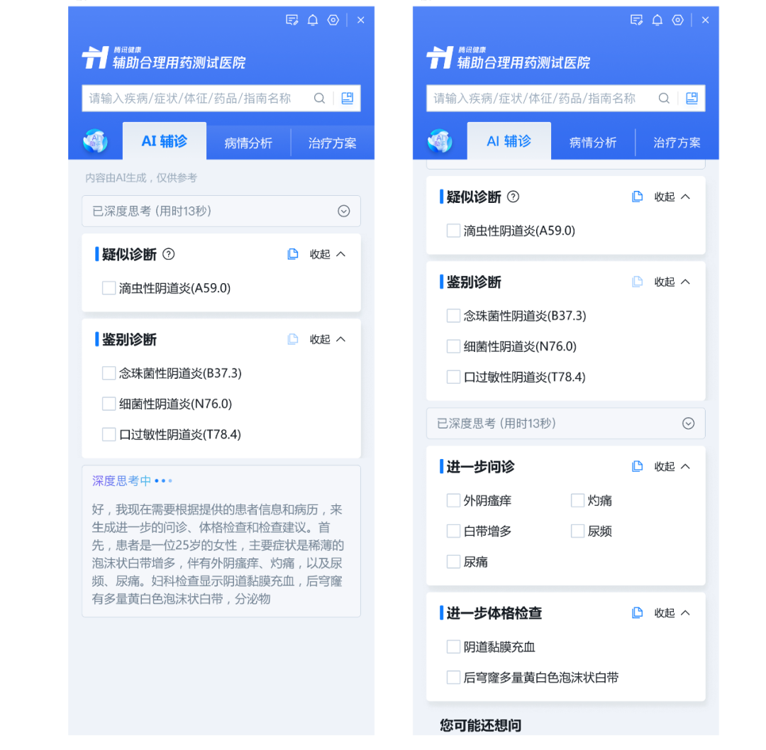 根据病历信息,“AI临床助手”经过深度思考分析病情后,即可列出疑似疾病列表,并按照置信度和危急程度进行排序和标识,并进一步提供鉴别诊断依据和治疗方案参考,辅助医生作出更全面的诊断和治疗。