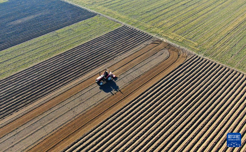 2月18日,在天津市宝坻区林亭口镇,安装有北斗卫星导航系统的播种机在田地内行进(无人机照片)。新华社记者 孙凡越 摄植保无人机