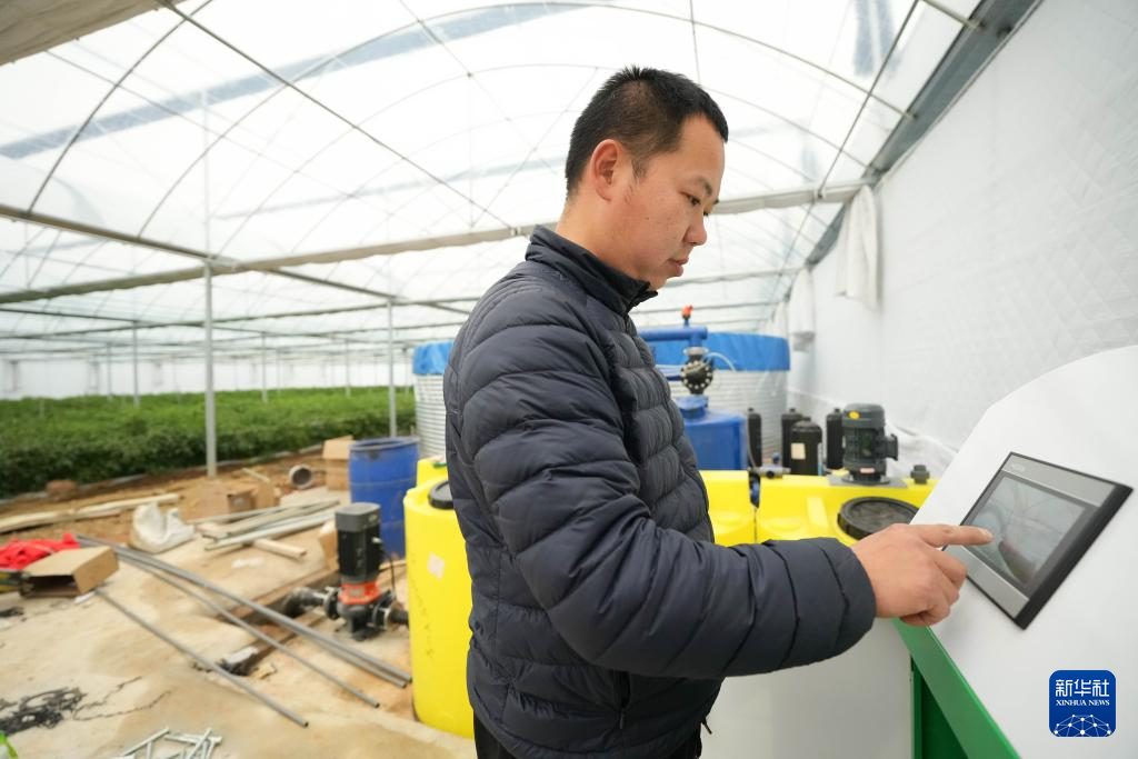 2月6日,肖胜蓝在宁乡市肖胜蓝家庭农场的温室大棚内调试水肥一体化灌溉设备。新华社记者 薛宇舸 摄