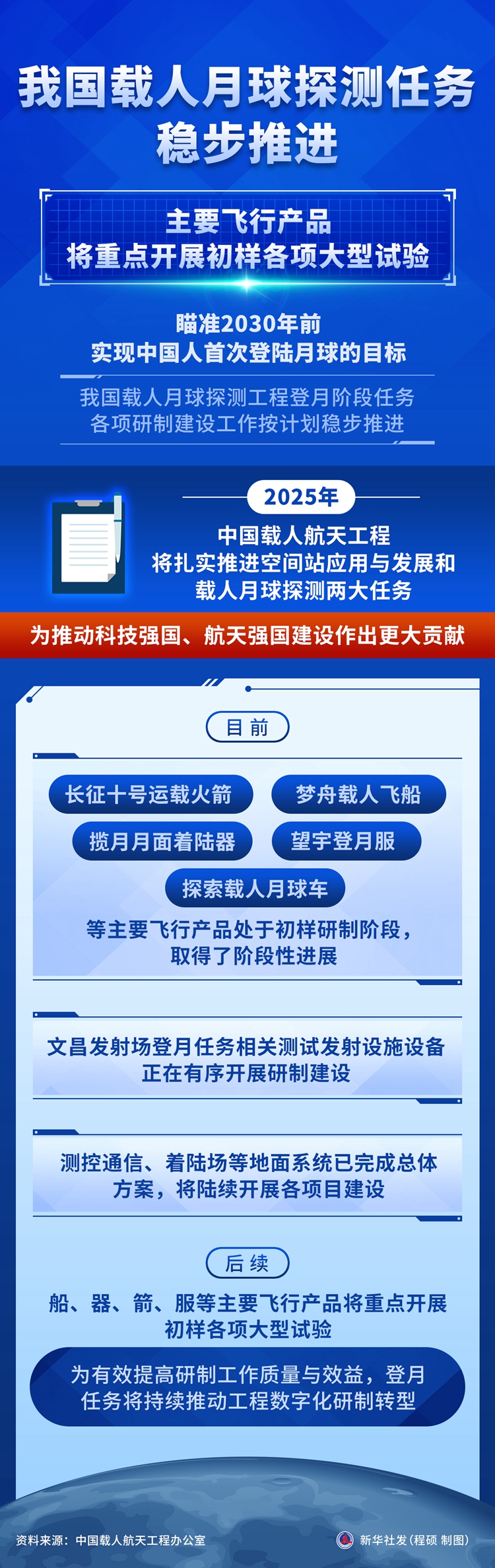 新华社北京3月3日电(李国利、李陈虎)记者3日从中国载人航天工程办公室获悉,瞄准2030年前实现中国人首次登陆月球的目标,我国载人月球探测工程登月阶段任务各项研制建设工作按计划稳步推进。2025年,中国载人航天工程将扎实推进空间站应用与发展和载人月球探测两大任务,为推动科技强国、航天强国建设作出更大贡献。