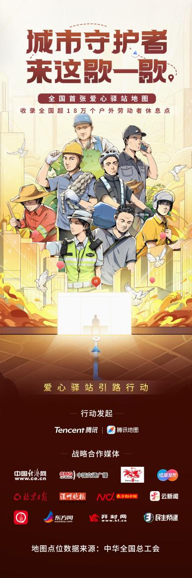 3月14日,腾讯发布“爱心驿站地图”,地图覆盖全国超18万个驿站点位,数据由中华全国总工会提供,主要包括各地工会自建驿站、银行电信营业网点、加油站以及中介门店等地点位置和设施服务信息。通过这张地图,外卖小哥、环卫工人、网约车司机、交警等户外劳动者可以快速找到附近的驿站,获取休息、热水、充电、避暑避雨等服务。同时,腾讯地图联合全国媒体发起“爱心驿站引路行动”,共同为“城市歇脚点”引路。