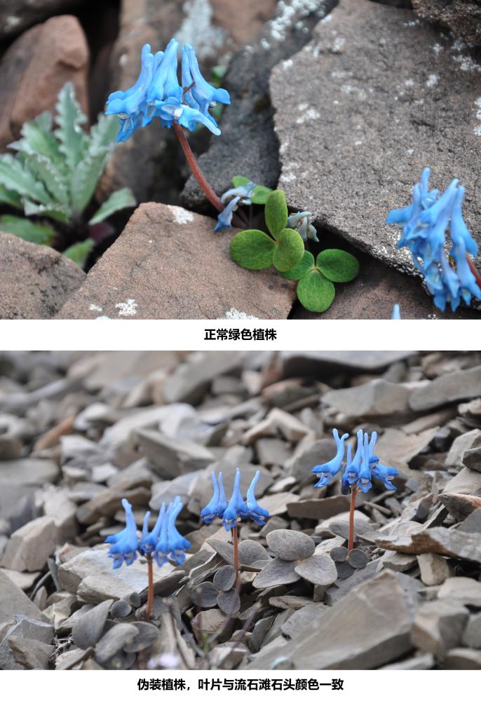 上:正常绿色植株;下:伪装植株,叶片与流石滩石头颜色一致。(图片由研究团队提供)