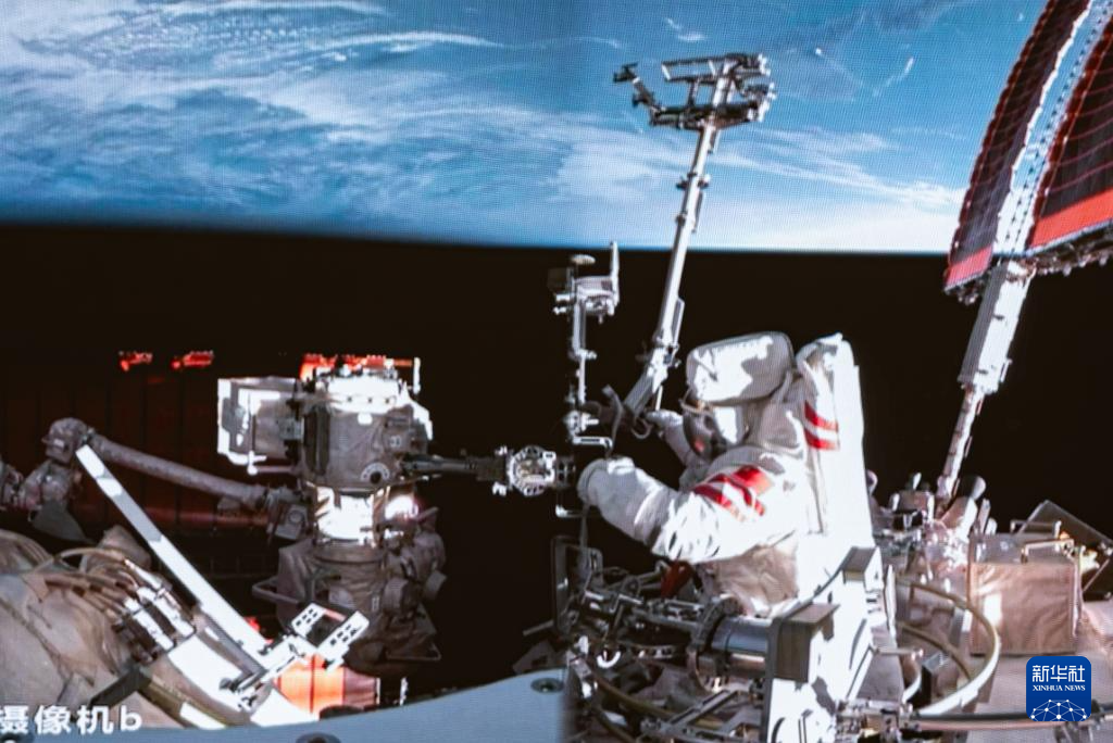 3月21日在北京航天飞行控制中心拍摄的神舟十九号航天员蔡旭哲在空间站组合体舱外工作的画面。新华社记者 李明刚 摄