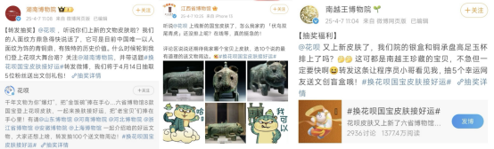 花呗文物皮肤上新,引发网友讨论,纷纷表示要换皮肤接好运。湖南、广东、江西等省的多家博物馆也在线@花呗,争相推荐宝贝,花式催更,希望自家宝贝的皮肤也能尽快上线。