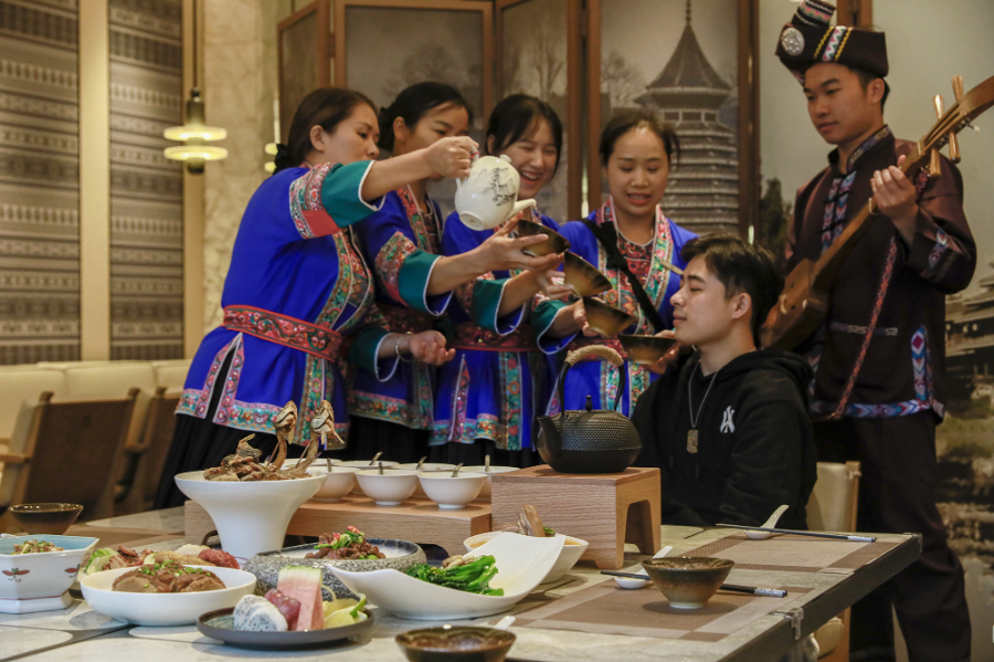 游客在柳州三江万怡酒店体验本地特色美食(柳州三江万怡酒店供图)