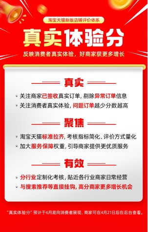 4月16日,淘宝天猫公告“关于新增《淘宝平台店铺真实体验分规范》的意见征集”,宣布即将上线新版店铺评价体系“真实体验分”。 公告称,淘宝天猫将重新制定能够真实反馈消费者体验的店铺评价体系,以解决行业虚假评分顽疾、提升消费者购买决策信心、激励商家提升服务质量。