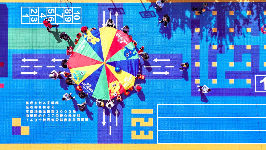 位于小丘镇中心幼儿园的第3000座美团乡村儿童操场,孩子们一起玩彩虹伞游戏