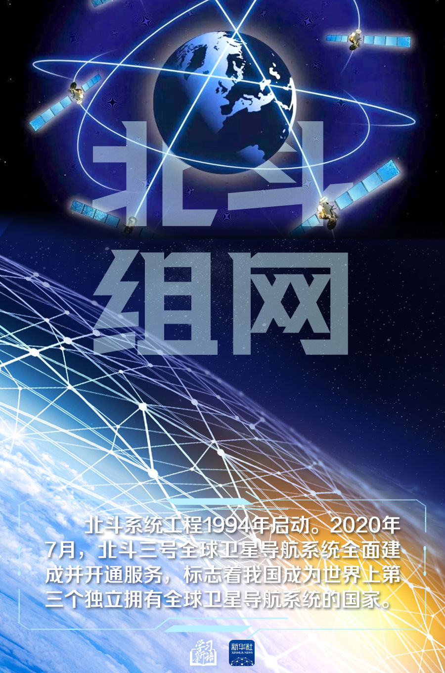 2020年7月,北斗三号全球卫星导航系统建成暨开通仪式举行。习近平总书记出席仪式,宣布北斗三号全球卫星导航系统正式开通。仪式结束后,总书记参观北斗系统建设发展成果展览展示。总书记充分肯定北斗系统特别是北斗三号全球卫星导航系统建设取得的成就,指出“参与北斗系统研制建设的全体人员迎难而上、敢打硬仗、接续奋斗,发扬‘两弹一星’精神,培育了新时代北斗精神,要传承好、弘扬好”。总书记强调“要推广北斗系统应用,做好确保系统稳定运行等后续各项工作”。