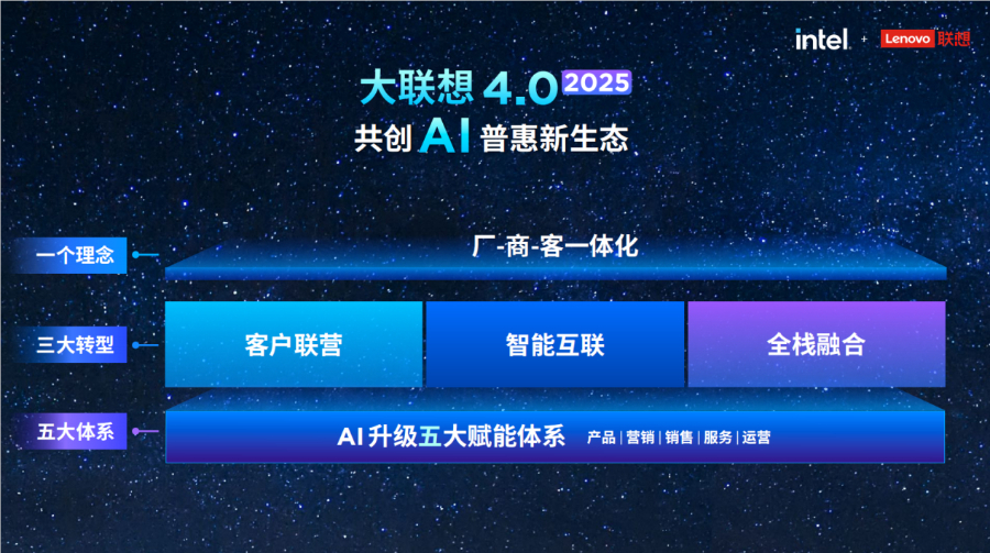 面对AI浪潮带来的史诗级机遇,“大联想4.0”在2025年全新升级。白晶在大会现场表示,“希望和大联想伙伴一起践行厂商客一体化的理念,向客户联营、智能互联、全栈融合三大方向转型。联想也会通过全价值链的五大赋能体系,为合作伙伴保驾护航。”