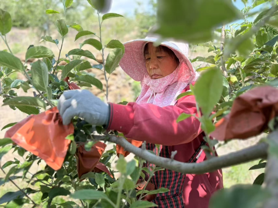 山东蜜桃进入成熟时节,农户正在为第一批蜜桃套袋