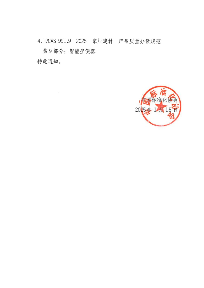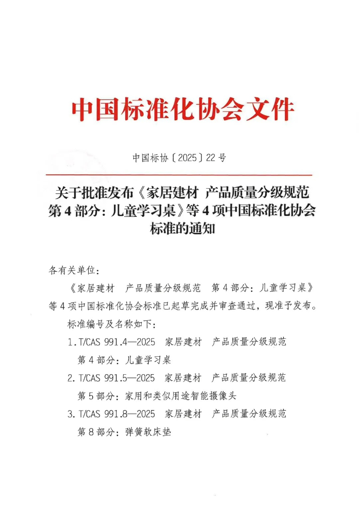 近日,中国标准化协会批准发布《家居建材 产品质量分级规范 第4部分:儿童学习桌》(T/CAS 991.4-2025)、《家居建材产品质量分级规范第5部分:家用和类似用途智能摄像头》(T/CAS 991.5-2025)、《家居建材产品质量分级规范第8部分:弹簧软床垫》(T/CAS 991.8-2025)、《家居建材产品质量分级规范第9部分:智能坐便器》(T/CAS 991.9-2025)四项团体标准。