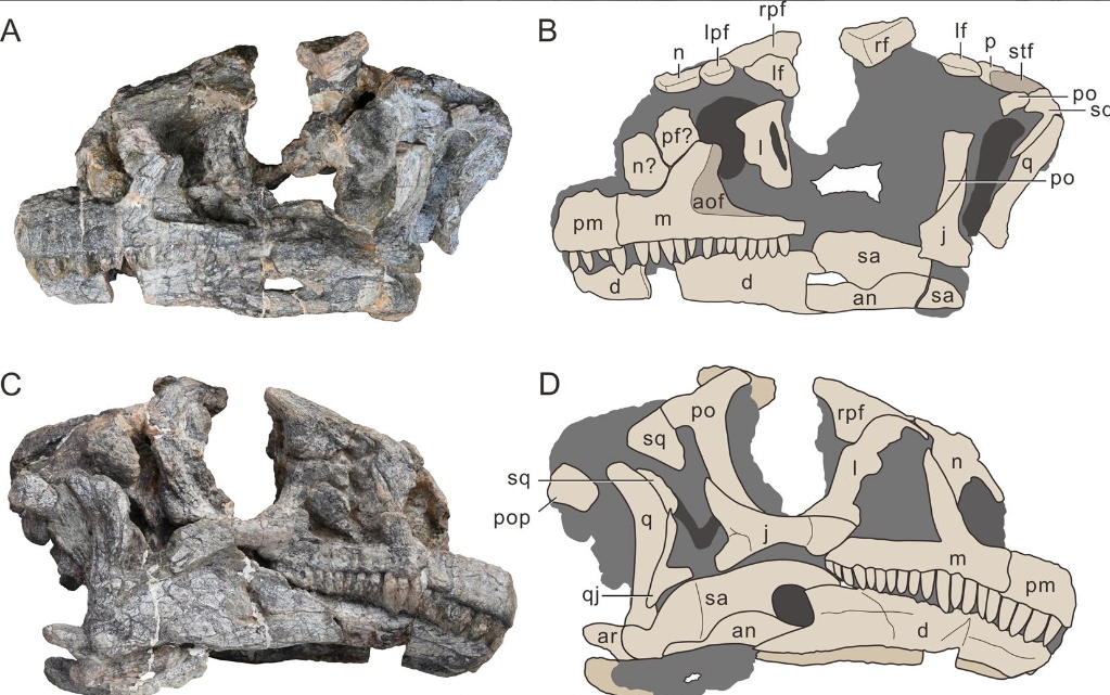 吴氏武定龙的头部骨骼照片及线描图。(中国科学院古脊椎动物与古人类研究所供图)