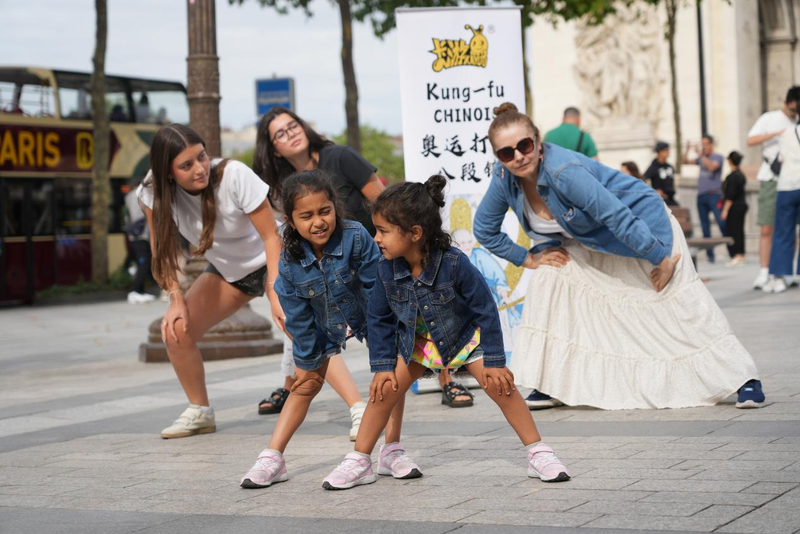 2024年7月在巴黎凯旋门前,志愿者们手持中国古代体育文化收藏卡中“八段锦”卡牌,邀请外国友人打卡八段锦。 受访者供图