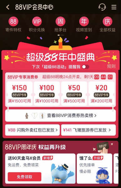 近日,88VIP与盒马会员体系首次打通。所有淘宝88VIP会员均可免费领取一张有效期为90天的盒马X会员权益,可享受盒马会员日线上线下88折、每日免运费1次、免费领菜等,领取时间持续至9月10日。合作上线几天,会员数翻了一番,越来越多的会员说明了消费者对盒马的认可。