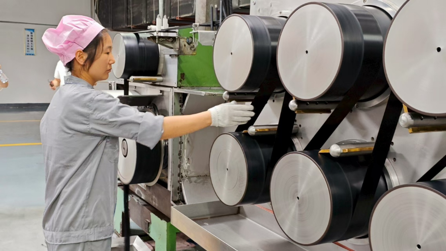 “看似不起眼的工厂车间,工艺却是颠覆性的。”一条褪色的牛仔长裤,经分拣、破碎后进入反应釜,在特定化学溶液中分解为小分子物质;经过提纯、聚合,这些物质转化为白色的切片;再经熔融纺丝,最终变成一卷卷光洁的长丝。“这条裤子最终能变成数件T恤的原料。”车间负责人透露,目前企业每月可处理近千吨废旧纺织品,产品已供应给多家服装、家纺企业。
