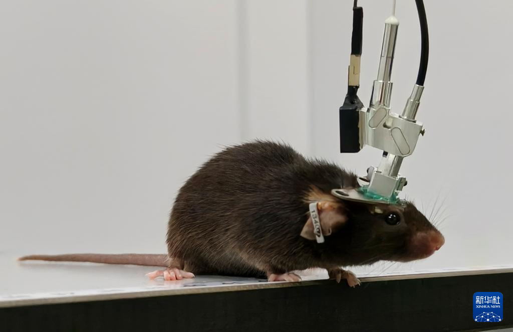 8月20日,佩戴多色微型化双光子显微镜的小鼠在实验中。新华社发