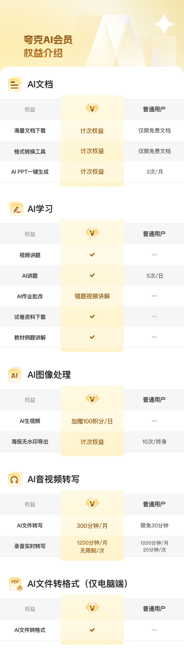 夸克“AI会员”包含AI创作工具套组(AI生图、AI视频、AIPPT)、语音转录及专业翻译、文档处理等核心AI能力。AI会员全面覆盖了学生从预习、作业到论文、求职的全周期需求。对于教师而言,这些工具可以满足备课、上课、答疑的一站式需求。