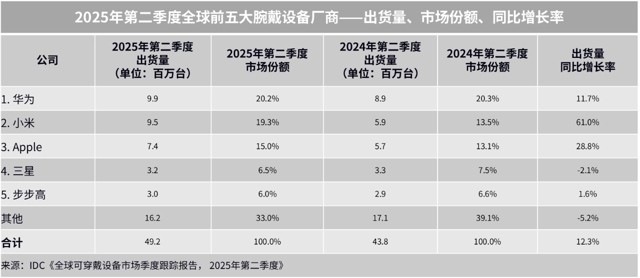 根据IDC的最新数据,2025年第二季度,华为在全球腕戴设备市场中以显著优势占据出货量领先位置,全球市场份额达20.2%。同时在中国市场也继续保持头部地位,实现了全球和中国市场的双赢。这一成绩的取得,离不开华为近年来在智能穿戴领域的持续投入和创新。