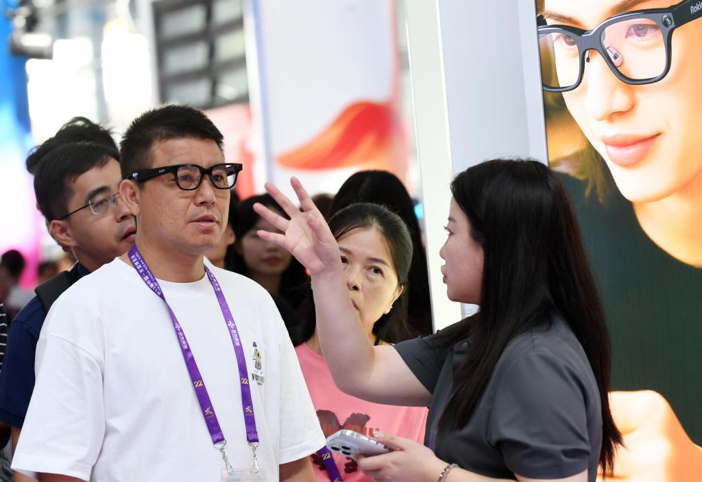 9月18日,在广西南宁国际会展中心,参观者(左)在体验一款AI眼镜。新华社记者陆波岸 摄