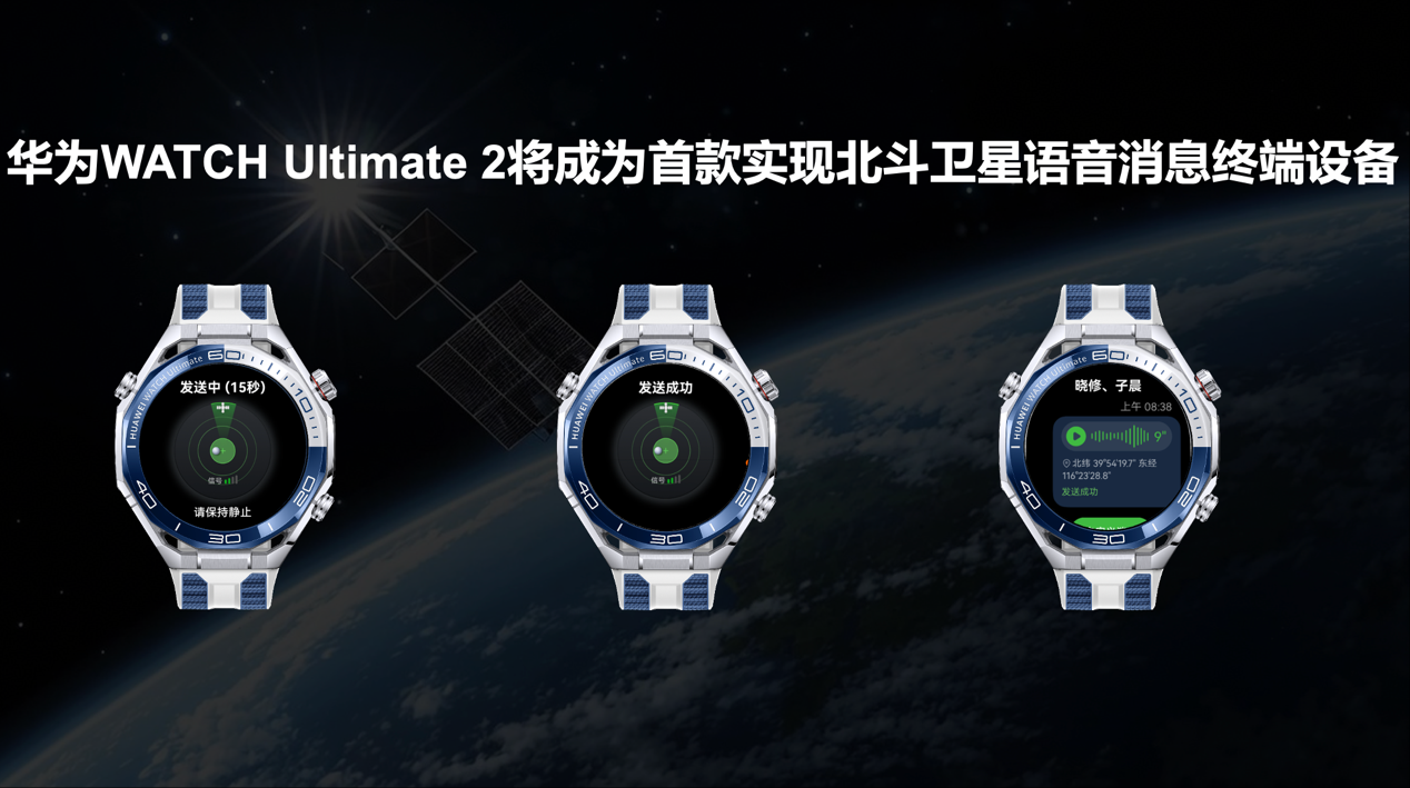 华为WATCH Ultimate 2是支持北斗卫星语音消息的大众消费终端设备。相比初代产品仅支持北斗卫星文字消息的功能,WATCH Ultimate 2在紧急情况下能够用语音更全面、准确地传递求救信息,甚至表达情绪,为救援工作争取宝贵时间。