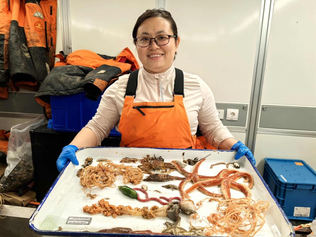 图为科考队员黄雅琴及其获取的北冰洋底栖生物样品。新华社记者刘诗平 摄