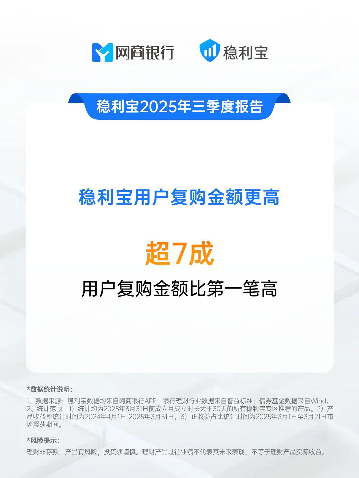10月11日,网商银行旗下银行理财专卖平台“稳利宝”发布2025年三季度报告。报告显示,截至9月末,稳利宝用户规模达到450万人,较年初的269万增长67%。用户黏性显著增强,每3个新用户中,就有2人投资了两笔以上,超7成用户复购金额比第一笔更高。