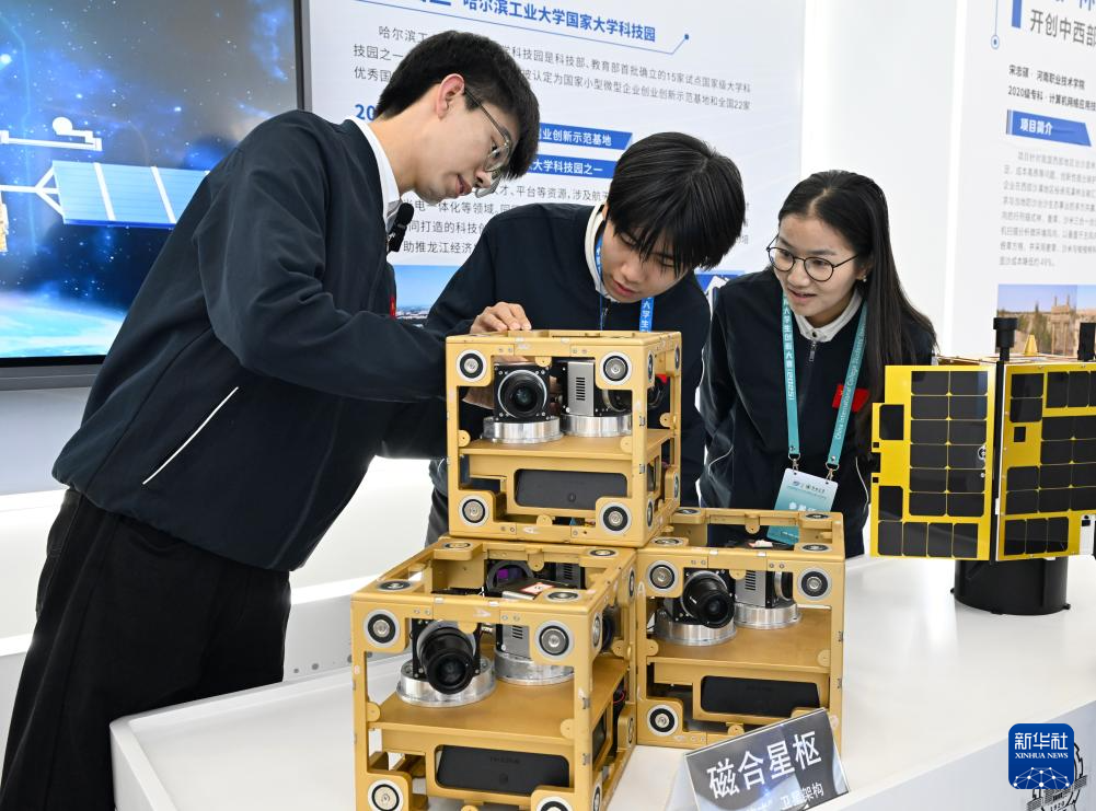 10月14日,在大学生创新成果展现场,哈尔滨工业大学代表在展示“磁合星枢——面向巨星座建设的新体制‘细胞’卫星平台”项目模型。新华社记者 郝源 摄