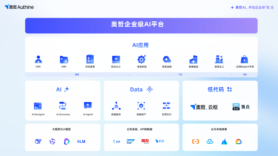 据奥哲CTO张华介绍,该平台具备三大核心AI能力:一是AI Designer:实现AI原生应用开发,通过生成业务蓝图和结构化代码,解决通用性Vibe Coding存在的效率、可维护性等问题,大幅度降低企业的开发门槛,提升开发效率。二是AI Agent:实现业务流程自动化,帮助企业将重复性工作交由AI执行,能自动处理如IT工单、客户服务等重复性任务。三是Data&AI Discovery:通过低代码进行数据治理,为零基础业务人员提供机器学习洞察,实现数据驱动的科学决策。