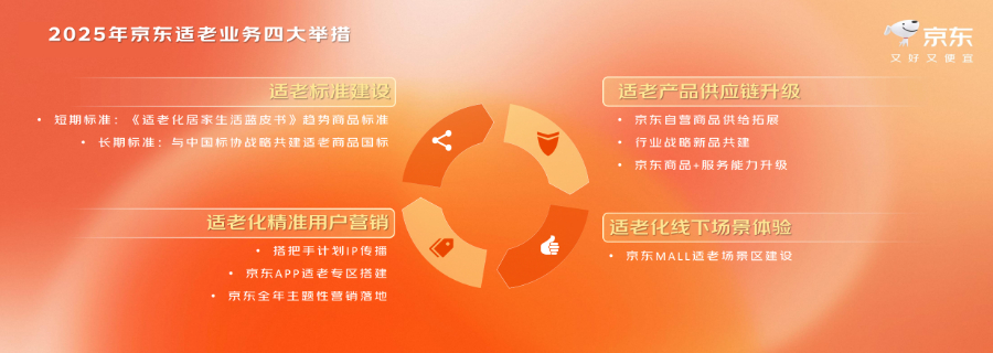 京东零售家电家居事业群建材业务部负责人在题为《2025年居家适老化改造近年成果及战略升级》的主题分享中宣布了京东适老业务的四大举措。一是正式构建适老市场化标准;二是在标准指引下,逐步推动整个适老行业供应链升级;三是在线下京东Mall开设适老产品展示专区,承接适老商品的体验工作;四是在适老标准指引下做好线上体验,做好线上精准营销,不断优化升级居家养老全场景解决方案,切实提升老年人生活品质。