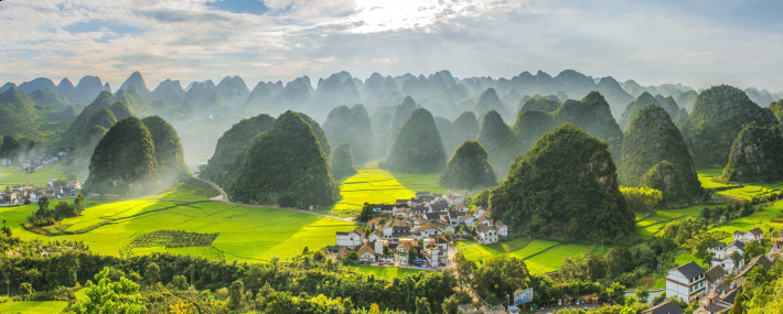 “万峰林峰丛如黛、纳灰河田园似锦”。