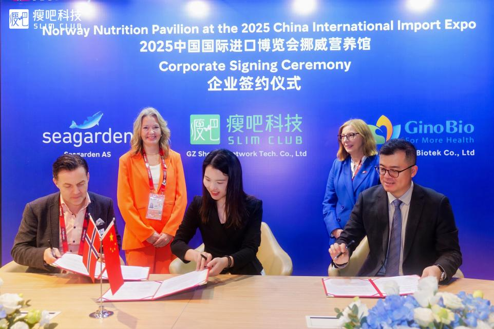 2025年11月,在第八届中国国际进口博览会上,作为数字健康管理领域创新代表的瘦吧科技,与挪威海洋原料企业Seagarden正式签署战略合作协议。挪威创新署执行副总裁Eva Camerer、亚太及中东地区总监Heidi Dahl等代表共同出席见证,标志着瘦吧科技在全球化资源整合与上游原料布局上迈出了新的关键一步。