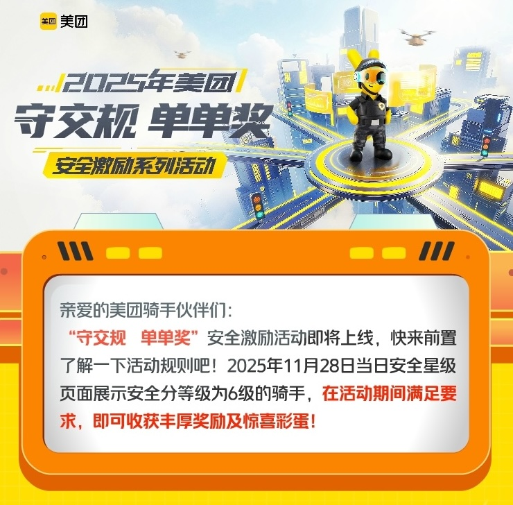 近日,全国各地美团骑手收到了最新的“不闯红灯”安全激励活动通知,骑手保持零闯灯纪录每天可获现金奖励。据美团方面透露,骑手安全相关负责人表示消息属实,活动期从12月2日全国交通安全日开始,本次活动相较此前的交通安全奖励有两项升级,一是范围从部分大城市扩展到全国近200城,涵盖专送和众包骑手,活动期间预计获奖骑手人次将达100万;二是丰富奖励形式,保持零闯灯纪录的骑手,根据不同单量档次每天都能获对应现金奖励,累计获奖金额排名前列的骑手还能赢取头盔、全新冬装等配送设备。美团已提前向骑手通知活动规则,激励骑手遵守交规,安全配送。