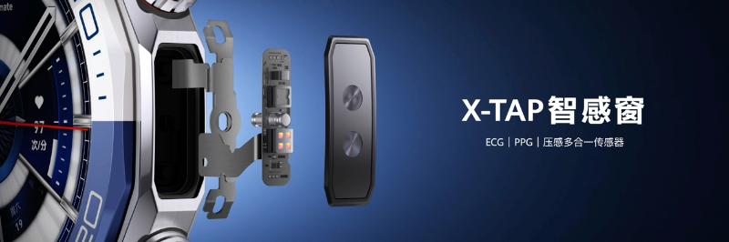 手表在表体右侧新增了X-TAP智感窗,内置ECG、PPG、压力三大传感器,与表底的超感知模组共同构成了全新的分布式玄玑感知系统,实现了更快速、更准确、更全面的健康检测。