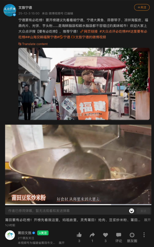 继锦州文旅后,宁德、莆田文旅官方喊话;“开榜先看我这里。”(图片来源:莆田文旅、宁德文旅)