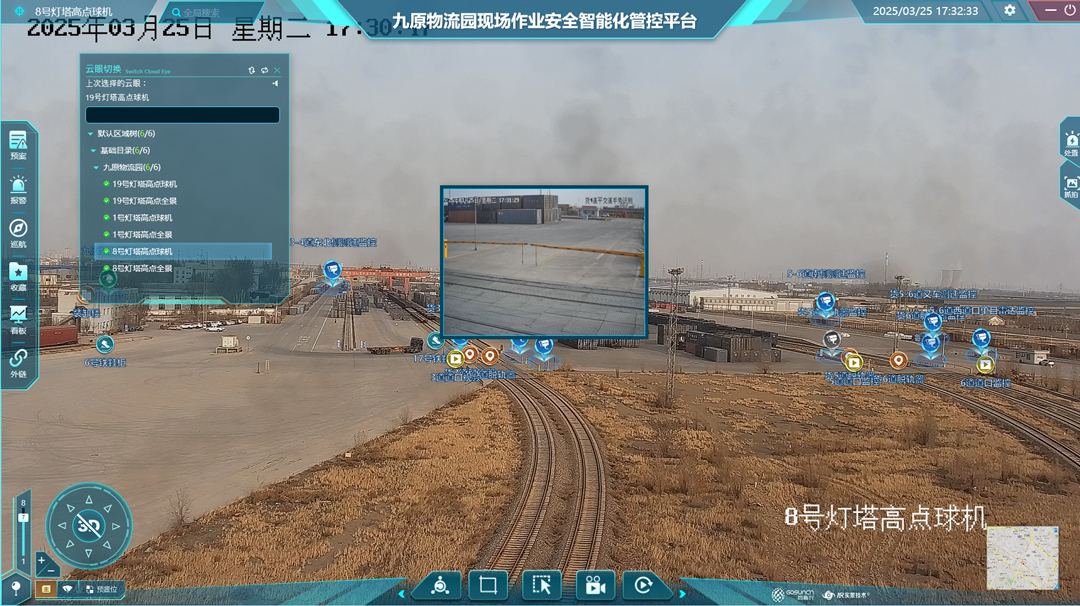 九原物流园现场作业安全智能化管控平台由高新兴创联科技股份有限公司联合呼和浩特局集团公司包头铁路物流中心,在九原物流园打造的现场作业安全智能化管控平台(信息系统)。该平台根据铁路货场用户的实际管理需求,深度融合货运业务,实现对物流园多业务系统的融合、安全监测及预警、报警,能第一时间锁定异常报警发生位置,提高应急处置效率,保障货场运营安全。
