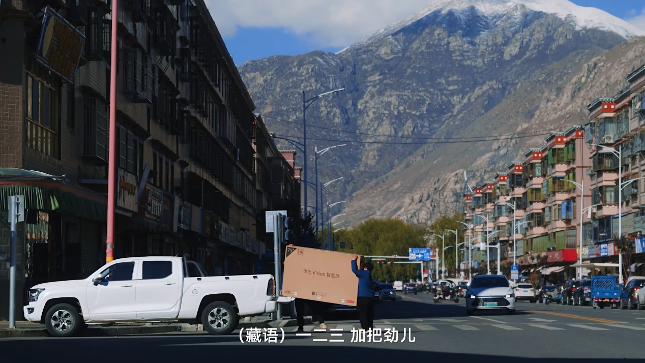 镜头转至西藏拉萨堆龙德庆区,平均海拔4500米的高原上,在低压低氧的环境,华为授权服务工程师带着氧气瓶迎难而上,克服重重困难,一方屏幕助力藏戏的传承,让这项古老的技艺在科技助力下被更多年轻人看见、喜爱。