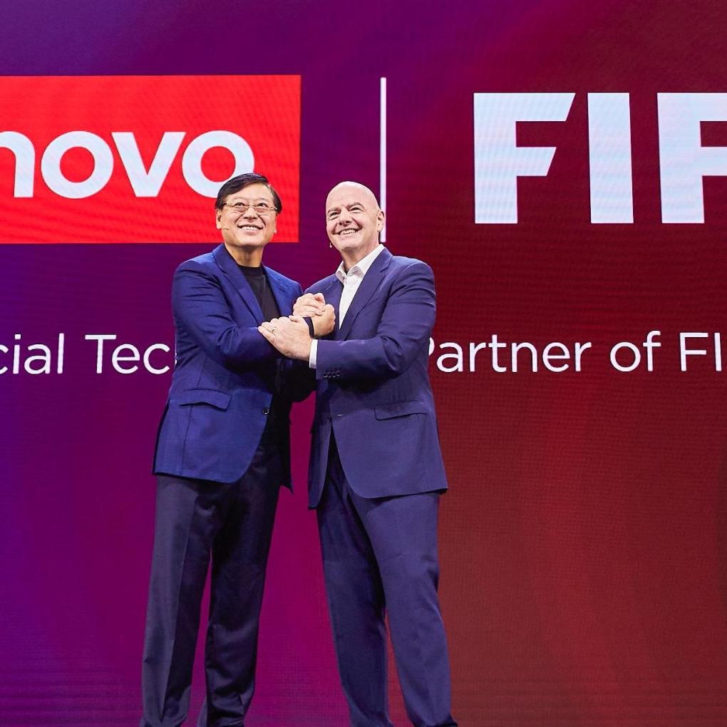 2024年10月16日,联想集团与国际足联宣布达成合作,联想集团成为国际足联官方技术合作伙伴。图为国际足联主席因凡蒂诺(右)与联想集团董事长兼CEO杨元庆