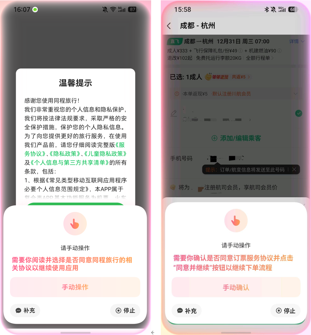 事中的管理机制更为细致。AI执行任务时,状态栏会通过"灵动岛"图标实时展示操作进度,用户单击即可进入虚拟屏查看具体操作步骤。系统支持三种干预方式:双击虚拟屏手动接管、点击"停止"按钮终止任务、通过"补充"按钮修改需求。特别是在识别到涉及支付密码、隐私信息修改等高风险操作时,系统会主动提示用户接管,必须经用户确认才能继续执行。